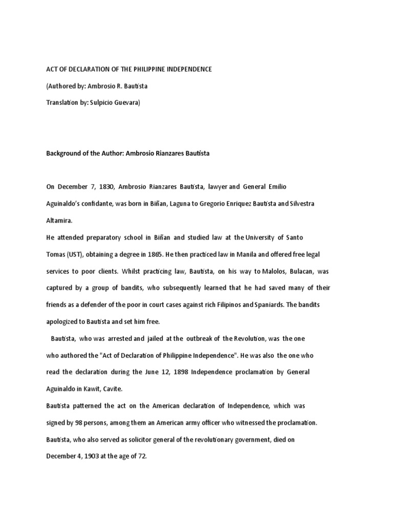 Designate” of the revolutionary Philippine government. It was read by Bautista during the