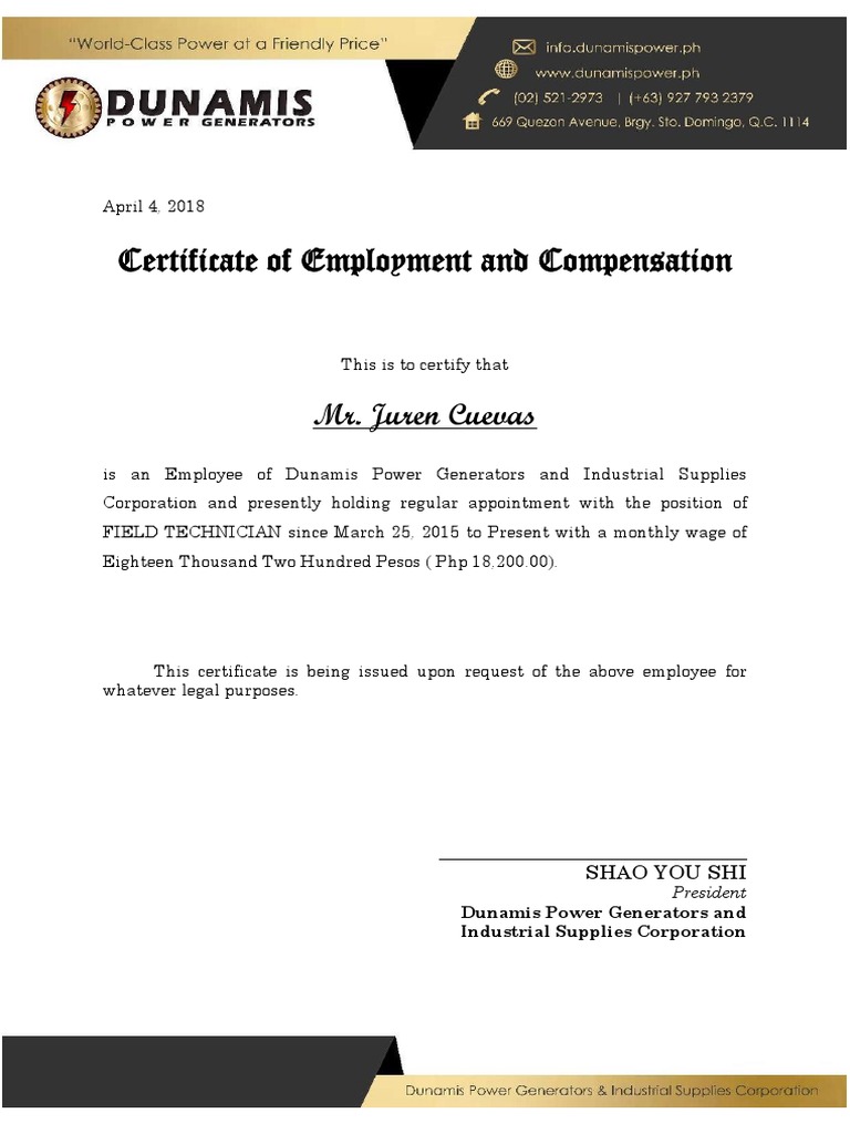 Certificate of Employment WITH COMPENSATION