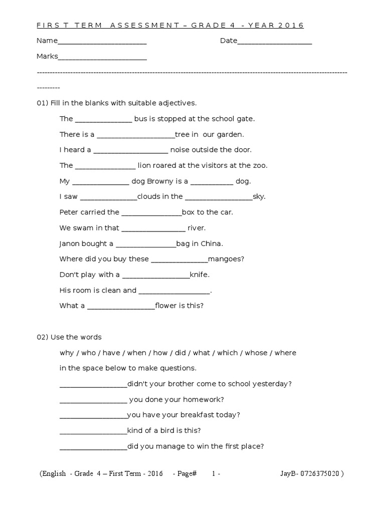 --------------------------------------------------------------------------------------------------------------------------------01) Fill in the blanks with suitable adjectives.