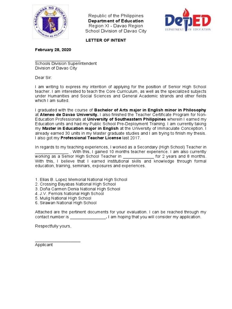 Letter of Intent For DEPED Teacher I