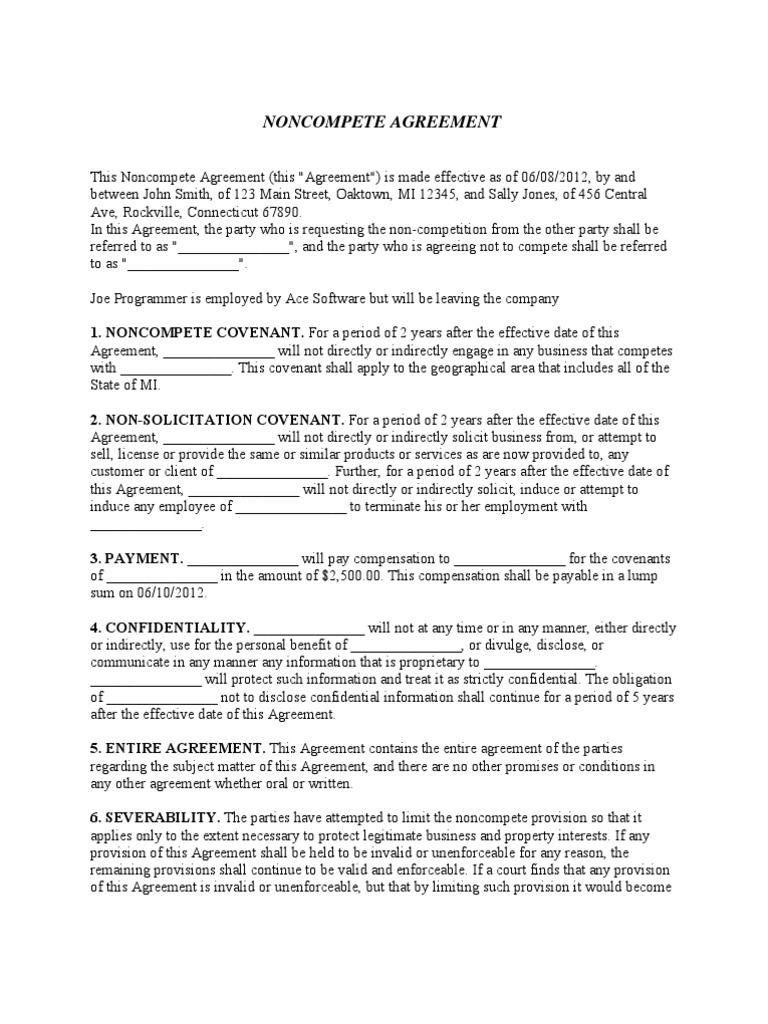 This Noncompete Agreement (this "Agreement") is made effective as of 06/08/2012, by and between John Smith, of 123 Main Street, Oaktown, MI 12345, and Sally Jones, of 456 Central Ave, Rockville, Connecticut 67890. In this Agreement, the party who is requesting the non-competition from the other party shall be referred to as "_______________", and the party who is agreeing not to compete shall be referred to as "_______________". Joe Programmer is employed by Ace Software but will be leaving the company 1. NONCOMPETE COVENANT. For a period of 2 years after the effective date of this Agreement, _______________ will not directly or indirectly engage in any business that competes with _______________. This covenant shall apply to the geographical area that includes all of the State of MI. 2. NON-SOLICITATION COVENANT. For a period of 2 years after the effective date of this Agreement, _______________ will not directly or indirectly solicit business from, or attempt to sell, license or provide the same or similar products or services as are now provided to, any customer or client of _______________. Further, for a period of 2 years after the effective date of this Agreement, _______________ will not directly or indirectly solicit, induce or attempt to induce any employee of _______________ to terminate his or her employment with _______________. 3. PAYMENT. _______________ will pay compensation to _______________ for the covenants of _______________ in the amount of $2,500.00. This compensation shall be payable in a lump sum on 06/10/2012. 4. CONFIDENTIALITY. _______________ will not at any time or in any manner, either directly or indirectly, use for the personal benefit of _______________, or divulge, disclose, or communicate in any manner any information that is proprietary to _______________. _______________ will protect such information and treat it as strictly confidential. The obligation of _______________ not to disclose confidential information shall continue for a period of 5 years after the effective date of this Agreement. 5. ENTIRE AGREEMENT. This Agreement contains the entire agreement of the parties regarding the subject matter of this Agreement, and there are no other promises or conditions in any other agreement whether oral or written. 6. SEVERABILITY. The parties have attempted to limit the noncompete provision so that it applies only to the extent necessary to protect legitimate business and property interests. If any provision of this Agreement shall be held to be invalid or unenforceable for any reason, the remaining provisions shall continue to be valid and enforceable. If a court finds that any provision of this Agreement is invalid or unenforceable, but that by limiting such provision it would become