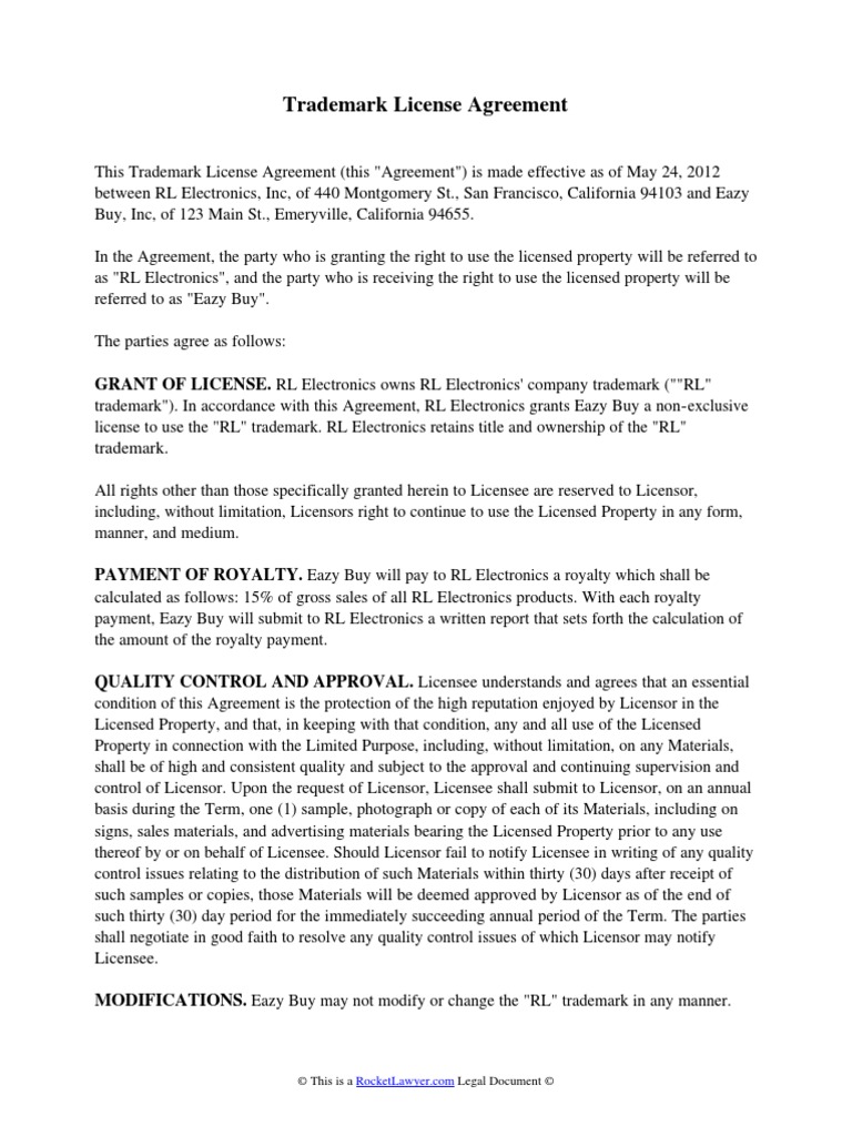 This Trademark License Agreement (this "Agreement") is made effective as of May 24, 2012 between RL Electronics, Inc, of 440 Montgomery St., San Francisco, California 94103 and Eazy Buy, Inc, of 123 Main St., Emeryville, California 94655. In the Agreement, the party who is granting the right to use the licensed property will be referred to as "RL Electronics", and the party who is receiving the right to use the licensed property will be referred to as "Eazy Buy". The parties agree as follows: GRANT OF LICENSE. RL Electronics owns RL Electronics' company trademark (""RL" trademark"). In accordance with this Agreement, RL Electronics grants Eazy Buy a non-exclusive license to use the "RL" trademark. RL Electronics retains title and ownership of the "RL" trademark. All rights other than those specifically granted herein to Licensee are reserved to Licensor, including, without limitation, Licensors right to continue to use the Licensed Property in any form, manner, and medium. PAYMENT OF ROYALTY. Eazy Buy will pay to RL Electronics a royalty which shall be calculated as follows: 15% of gross sales of all RL Electronics products. With each royalty payment, Eazy Buy will submit to RL Electronics a written report that sets forth the calculation of the amount of the royalty payment. QUALITY CONTROL AND APPROVAL. Licensee understands and agrees that an essential condition of this Agreement is the protection of the high reputation enjoyed by Licensor in the Licensed Property, and that, in keeping with that condition, any and all use of the Licensed Property in connection with the Limited Purpose, including, without limitation, on any Materials, shall be of high and consistent quality and subject to the approval and continuing supervision and control of Licensor. Upon the request of Licensor, Licensee shall submit to Licensor, on an annual basis during the Term, one (1) sample, photograph or copy of each of its Materials, including on signs, sales materials, and advertising materials bearing the Licensed Property prior to any use thereof by or on behalf of Licensee. Should Licensor fail to notify Licensee in writing of any quality control issues relating to the distribution of such Materials within thirty (30) days after receipt of such samples or copies, those Materials will be deemed approved by Licensor as of the end of such thirty (30) day period for the immediately succeeding annual period of the Term. The parties shall negotiate in good faith to resolve any quality control issues of which Licensor may notify Licensee. MODIFICATIONS. Eazy Buy may not modify or change the "RL" trademark in any manner.